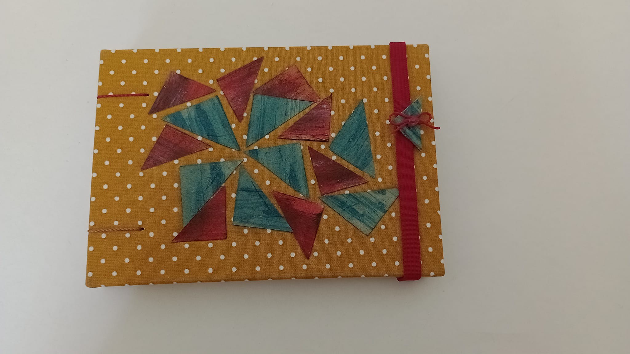 Capa dura, revestido com tecido estampado (poá) e recortes de recouro tingido, de triângulos imitando uma “explosão” ; costura copta Etíope (2 cores) ; fechamento com elástico solto.