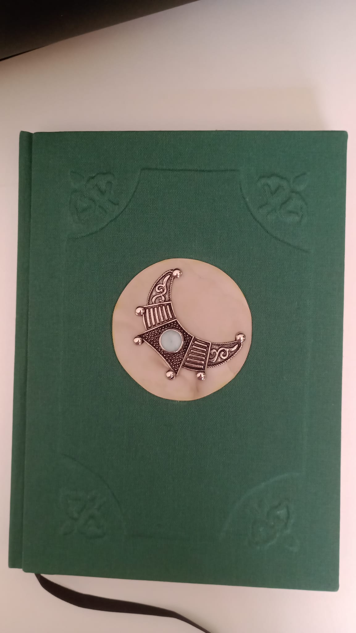 Livro capa dura, com lua de metal prata, com pedra verde-claro ao centro, revestimento em tecido Saphir verde-alecrim. Costura interna. Miolo: 48 folhas/96 páginas envelhecidas com café, de 90g/m2, onde você pode fazer suas anotações especiais.